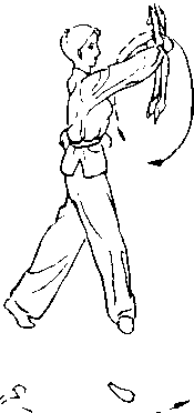 接上式,两手握扇随重心前 移,左脚虚上步,向外仰面打圆, 扇面向外(图5-16)。