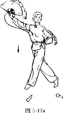 ① 接上式,随重心前移, 左转腰,左手握扇盖向左腰 背后;同时右手握扇向内在 头部高度.扇面向左侧方向 推扇(图5-17a)0
