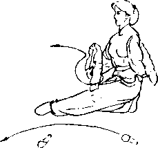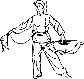 接上式.,两手握扇随重心前移, 右脚内扣左转身180°向内向下;左 脚退步后坐,两手至腹前,手心向 上,扇顶相对(图5-15)。