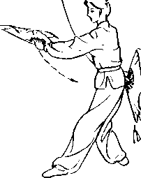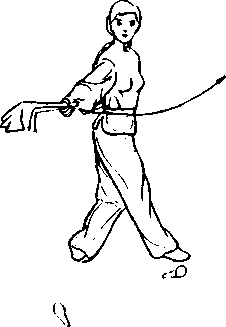 ② 左手握扇随右脚直立 向外向下至左胯旁,手心向 下.同时右手握扇提起至头 上方,扇顶向前,方向左45° (0 5-19b)o