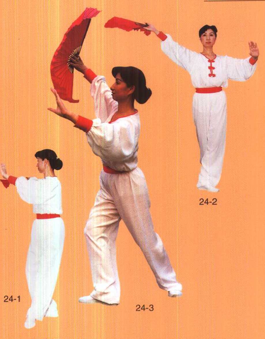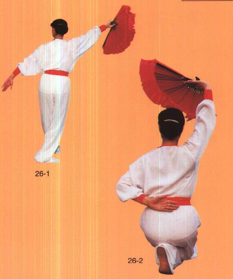 接上式,随右转腰两手略带向右;左脚外撇重心前移, 随右脚左45°上步右手向外翻扇,两手在胸前■成推掌式。 随右脚内扣两手向下,随左180。转身左脚向后插步,同时 左手向外向上至左额上方翻掌,右手握扇屈肘向里至右胯 旁,然后至右胯后下侧关扇,重心在左脚。