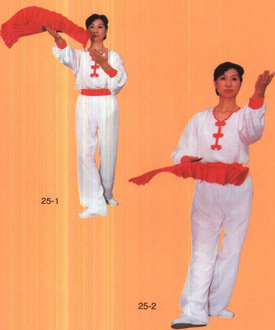 接上式,左转腰45°至正方向,同时右手翻腕转扇面 向上向前伸出,左手翻腕转掌心向上屈肘收至腰前,两手 平行同肩高。随后坐左手向前伸出,右手托扇屈肘向里收 至腰前。