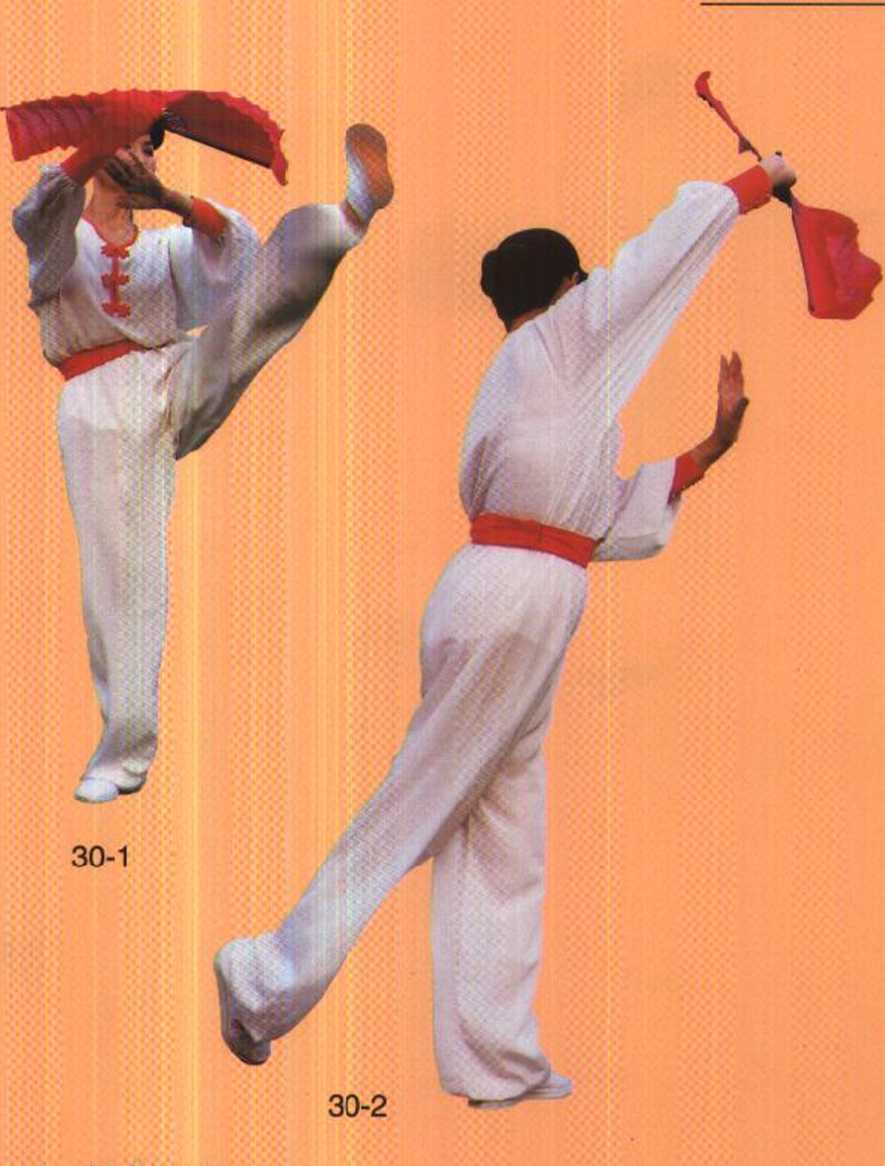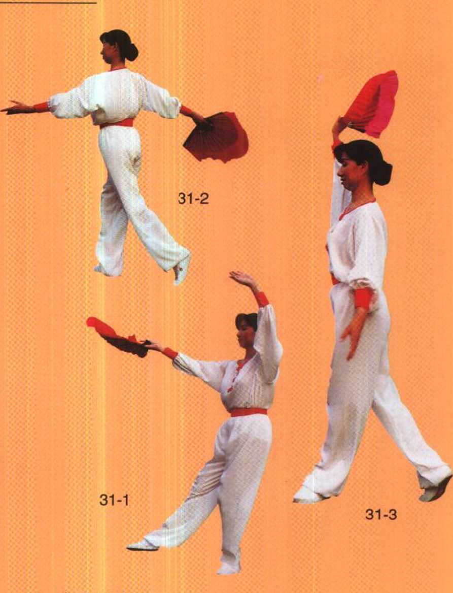 接上式,右脚上步,两手随腰向外顺时针仰面打圆, 随重心前移腰略右转两手收至右肩前:右手托扇扇面向上, 左手指靠近右腕上方。30.斜身照影:接上式,左脚向前蹬脚落步,随重心前移左转腰,同 时右手握扇向外翻扇至右额上方,左手在胸前推掌。眼看 左后侧。