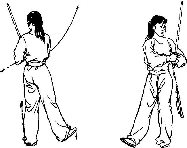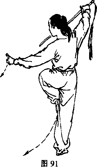 1.右脚向前上步,脚跟着地,身体左转,右脚尖内扣。同 时右手握剑向左、向下划弧至左腹前,手心朝内,剑尖向左划 弧至左斜上方;左指下落于右手腕处成立指。目视两手(图 89、90 附图)。图89 图90附图2,右脚前掌落地,重心右移,右腿独立支撑;左腿体前屈 膝提起,上体微左转。同时右手握剑使剑把向右、向上提起至 头侧前上方,手腕内扣,剑尖斜向左下;左指向左下摆至左胯 侧,手心斜向下。头略左转,目视左前下方(图91)。