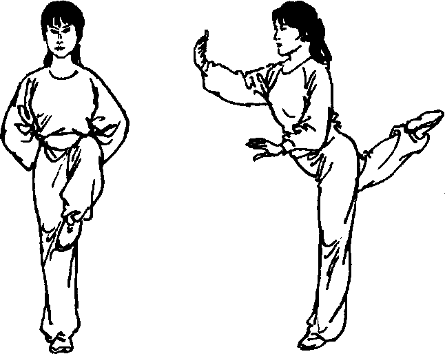 一腿支撑直立;上体侧 倾拧腰向支撑腿同侧方上 翻,挺胸塌腰;另一腿在身后 向支撑腿同侧方上举,小腿 屈收,脚面绷平,脚掌朝上