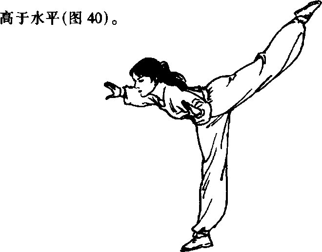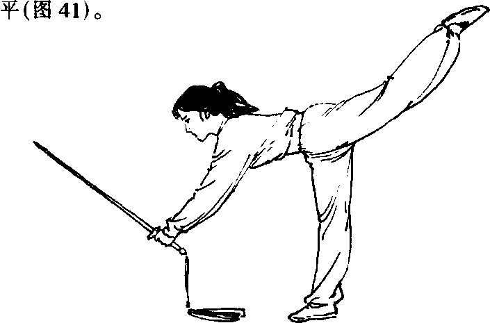 一腿支撑直立;上体前俯略低于水平,抬头挺胸;两手臂 向前下伸出;另一腿向后举起,膝自然伸直,脚面绷平,高于水