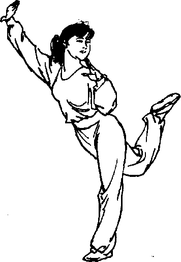 (五)望月平衡一腿支撑直立;上体侧 倾拧腰向支撑腿同侧方上 翻,挺胸塌腰;另一腿在身后 向支撑腿同侧方上举,小腿 屈收,脚面绷平,脚掌朝上(图 42)。图42