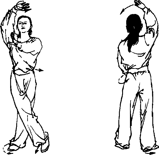1 .右脚盖步,身体左转90。。右手向左上划弧至头上方, 手心斜向上;左手至右胸前屈腕(图27)。