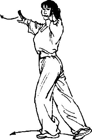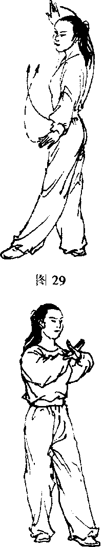 3 .身体继续左转90。。左手向左摆至左胯旁,右手微向下 划弧(图29)。