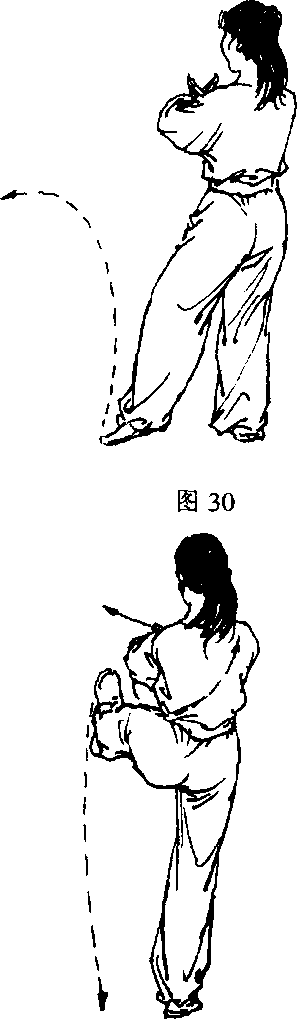 5 .两手不变。右腿支撑,左腿屈膝提起向右前30。蹬出 (图 32)。