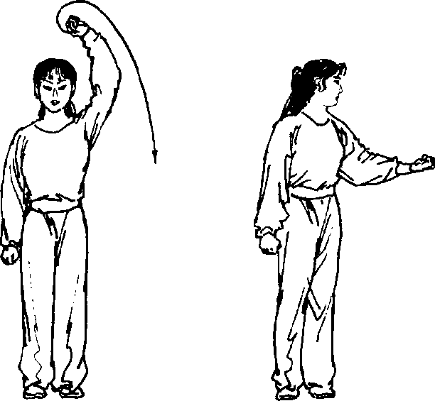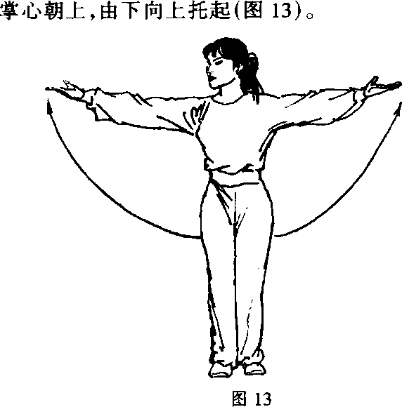 (一)请拳左掌掌心与右拳拳面在胸前相抱,两前臂微内旋,高与胸 齐,掌、拳与胸部距离20 ~ 30厘米(图10) o图10(二)搬拳一手握拳,前臂外旋向下翻压(图(三)托掌