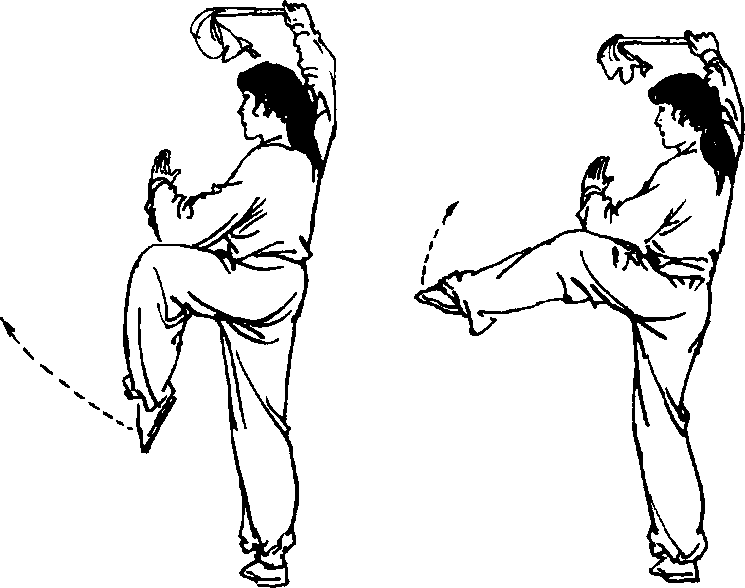 3.上动不停。左腿挺膝,脚尖勾起,脚跟向左前上方45。 蹬出,脚高于胸。目视前方(图27)。