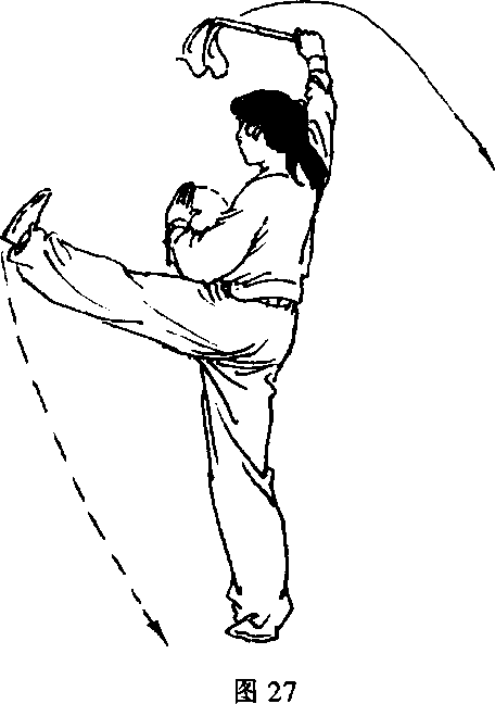 2,上动不停。左小腿上摆至腰高,脚背向上(图26)。