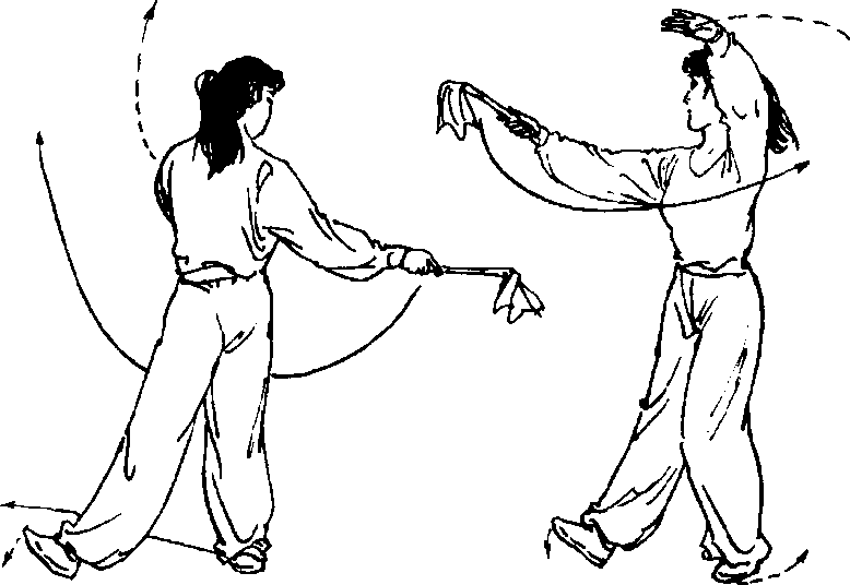 5.左脚尖外展落地,重心左移;右脚向右前45。方向上 步,脚跟着地。同时左手向左上摆起至头额左前上方架掌,掌 心向上;右手外旋,手心向上,由后向右脚前上方撩扇,手略高 于肩,扇顶斜向上。目视扇顶方向(图29)。