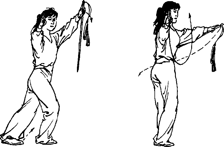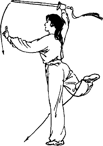 3 .右脚跟落地,重心后移。同时左手持剑向前上摆至腹