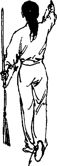 1 .身体微向左转,左脚向左前上步,脚前掌着地,脚尖外 展。两手臂微下沉,剑与左前臂成水平,剑尖朝后(图26)。