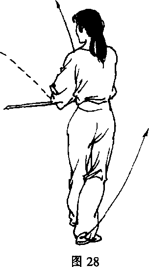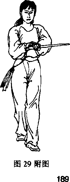 前,手心向下,剑尖朝左后;右前臂内旋,手心向下落于剑把上 接剑。目视两手(图28、29附图)。
