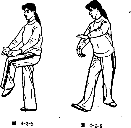两手托盘在腹前手心向上,手指相对,提起左脚,左脚心 盖右膝盖,右脚下沉,左脚随至转180°打圔退步,身体随至 转180右脚上步并脚,两手收势在两胯旁(园425)。抱球旋转左脚45°站掌,重心在左脚,右脚脚跟和左脚成丁字步法, 两手抱球状,左手在上,右手在下,两手心相对,右脚劈脚,身 体随劈脚旋转360°,右手随右转腰拉开,随左转腰收,随右转 腰绷,两手在胸腹间手指相对,两手心向下(图428〉。