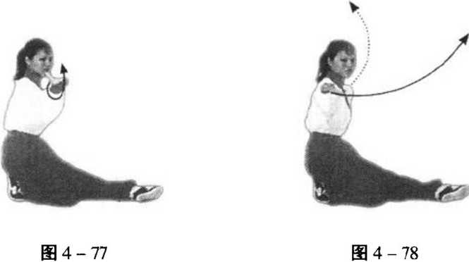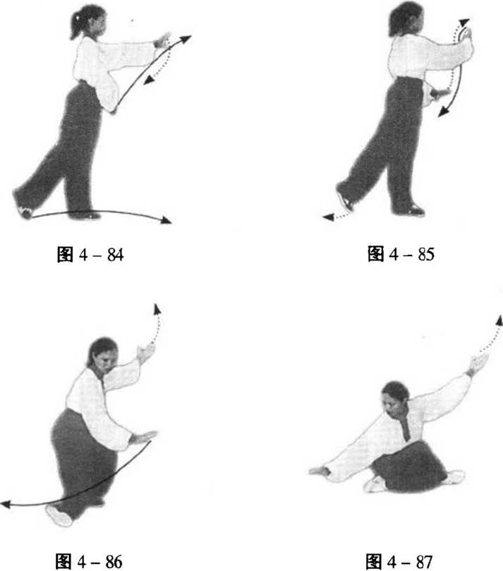 4. 左脚经右腿后方向右后插步,身体微向左转再向右转拧 腰;两腿屈膝下坐成坐盘式。同时右臂内旋向右下划弧扫M体右 下侧,手心斜向下;左手经右前臂内侧虎口向前上穿出,两臂自 然伸直成一斜线。目视右手(图4-86、4-87)。