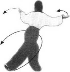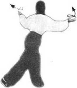 2. 两脚跟离地,以脚前掌为轴向左后转体135度(东南)。 两臂随体转立圆绕摆至体两侧,高与肩平,手心向下(图4- 83)〇