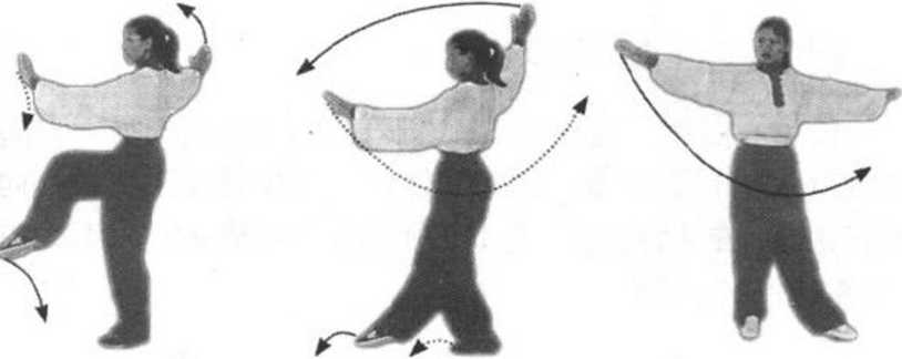 1. 重心前移,左腿独立支撑,右腿膝微屈向前提起,以左 脚掌为轴身体向左转135度(正西)。同时右腿随转体里合摆至 体前,脚前掌向前落步。左手向下、右手向上划弧。目视前方 (图 4-81、4-82)。