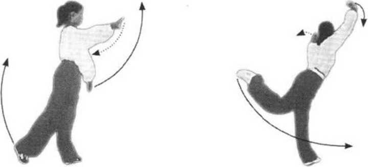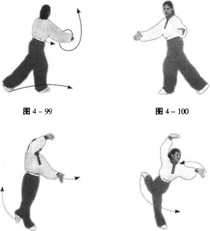 1. 右腿蹬起,重心前移;左腿屈膝,身体直起微向左转。 同时右手臂外旋向前摆起,略低于肩;左手臂外旋向下、向前划 弧摆至体前,两掌心相对(图4-99、4-100附图)。