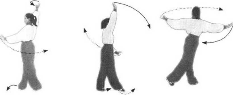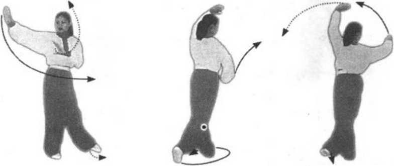 [要点]原地旋转一周时以腰带臂需柔缓圆活;左拧腰、后 举腿、架掌、摆掌需协调一致。