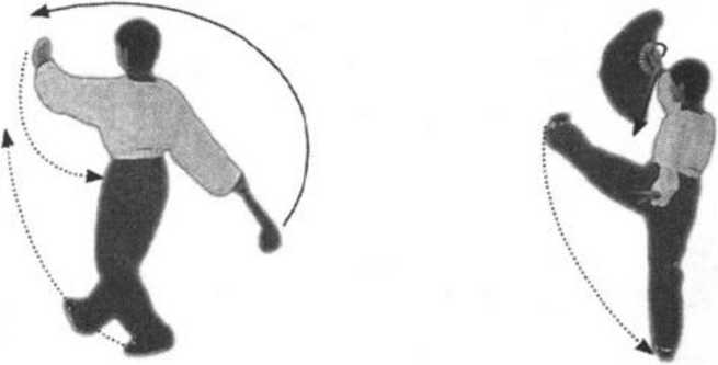 [要点]轮臂需松肩,抡立圆,开扇抖腕干脆有力,力达扇 沿;踢腿、开扇、摆掌三个动作需同时完成,定势后微控腿。