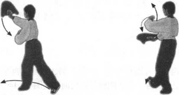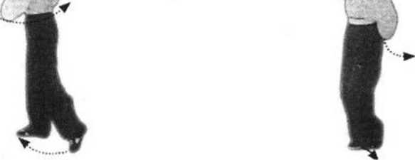 2.重心前移,两腿微屈,右脚跟向前与左脚跟并拢成八字 步。同时左手外旋,手心朝上,抬至头上方,手心斜向内。然后