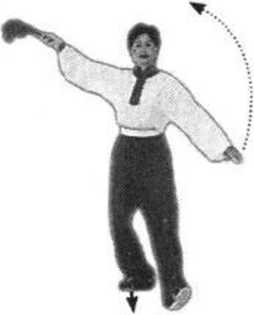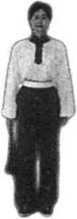 图 5-154 图 5-155[要点]合扇与丁步动作需紧凑、协调。合扇干脆有力,力 贯大扇骨前部。图 5-154 图 5-155[要点]合扇与丁步动作需紧凑、协调。合扇干脆有力,力 贯大扇骨前部。手背贴于腰部。目视扇顶方向(图5-154、5-155)。