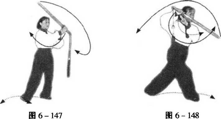 侧,虎口剑尖均斜向前下;左指随右手转动至右腕处。头略向左 转,目视剑尖方向(图6-148)。