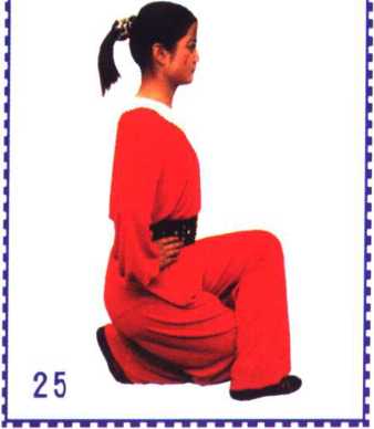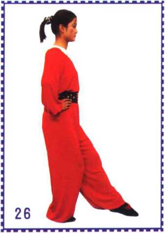 做 法:后腿支撑,屈膝,脚尖外 展60度;前腿自然伸直,脚尖夕卜展45 度,前脚掌着地(图26)。