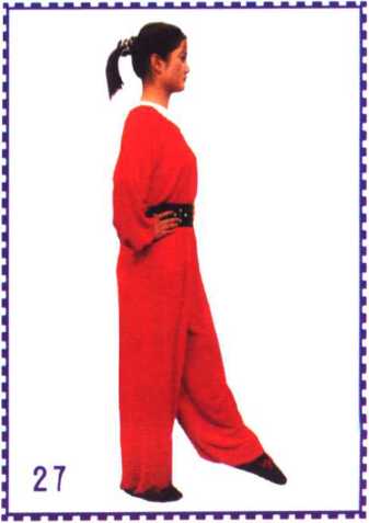 做法:后腿支撑自然伸直,脚尖 外展45度前腿自然伸直,脚前掌着地, 脚尖略外展(图27)。