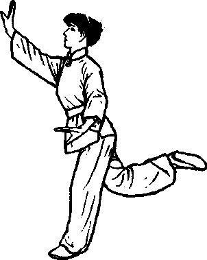 图 5+40要点:重心在左脚,左手 在左胯旁向下压,右手在右 前方,推掌,眼看右前方,身 正,提起后右脚,脚心向上。