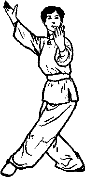 从上式,双手从腰部伸向后面,跷起右脚在身后,脚心向 上,两手从两侧转向前方在胸前,右手握掌,左手心推住右手 拳,右脚跨步向前放下,两手心向上从腰后部抽出,成抱球状, 左脚收回离右脚一拳距,两手心向上在前抱球形拉下,身体淅 起,两手回到南胯旁,收势结束(图5142)。