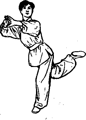从上式,两手相随打一 圆,右手穿向右前方,推掌 式,左手移向左脖旁,提起右 后脚,脚心向上(图5140)。