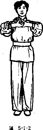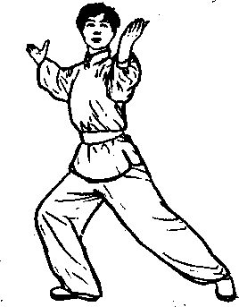 从上式,左脚下沉为实步,右脚为虚步,渐提起,身体向右 转,重心向前、弓步,两手心从腰部再向两侧拉开,翻动手腕, 手心向上,托掌同肩平,左后脚跟劈脚,身体渐后坐,右脚掌向 右劈脚。然后身体重心向前(图513)。圆5卜3要点:上下配合协调,转身时先看翻掌右手,再眼睛平视>圆5卜3