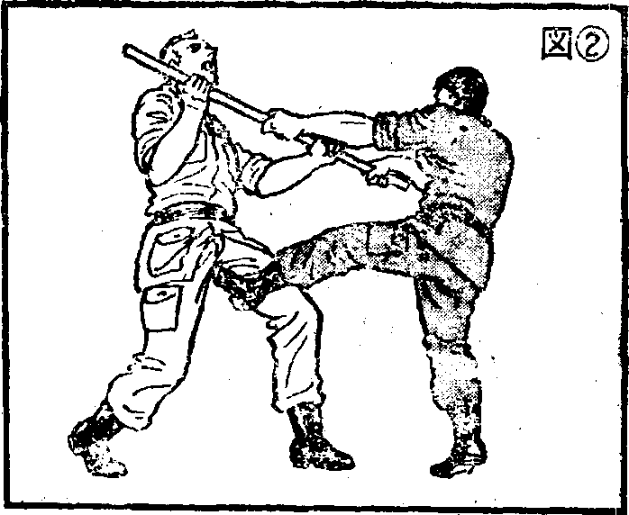 不要着急?这是必须的。无论出现什么情况手都不要松离棍棒要象荻对方拉过去似地很自然地向对方靠近。当你靠到最佳距离时要用脚背去踢对方的裆部(图23-2)。踢时不要提膝只需将整个腿从大腿部开始绷成一条棍似地单纯地去踢即可。