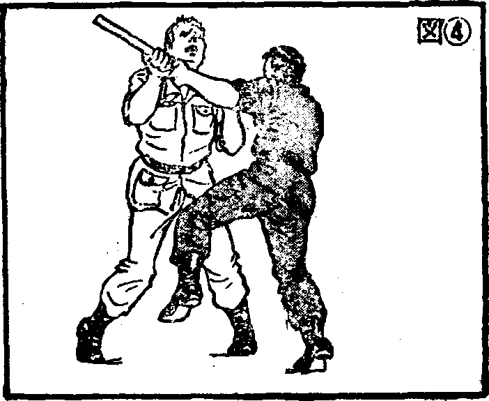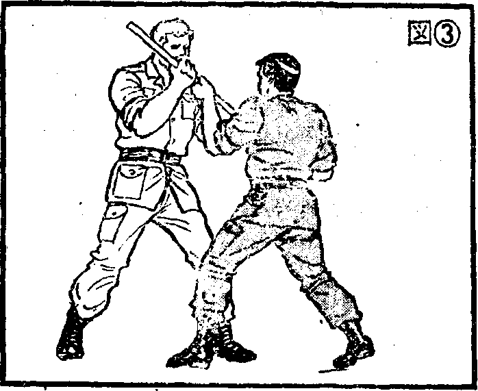 如果近得连膝盖也用不上,就迅速将一只手松离棍棒将此手变掌用掌上侧即拇指和食指部分短促地上击对方裆部即果可能亦可狠攘其裆部。用掌尖或指关节捅也很有效