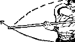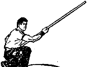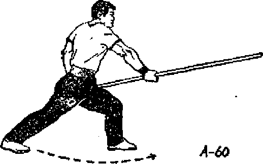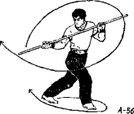 ① 右脚向前跨~步成右盖步。双手先后向前滑棍。然后 右臂向后收回至右肋,使棍梢向右平摆(图A56).