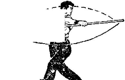 ② 左脚经右脚前横磨一步成左羞步“同时,双手握棍便 棍梢由右向后、向左经头部平绕到胸前,两臂交叉屈肘* 右手握棍位于左肘上,手心向下,左臂屈肘,左手握棍贴于 右敝下,手心向后’棍梢与左肩同一方向,目视棍梢(图A 57八