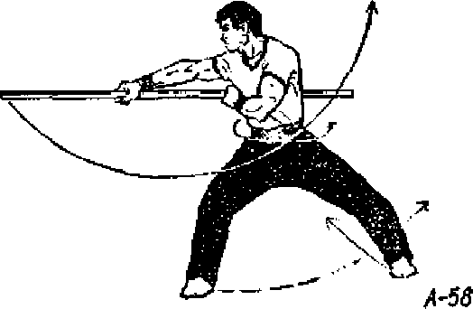 ③ 上动不停,右脚向右跨一步成马步,同时*上钵右 转,双手握棍由左向前*向右拨击,棍与W¥o右手伸直握 棍,左手握棍贴于右跋下尊目视棍梢(图A58),