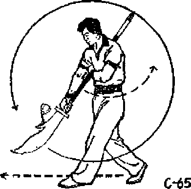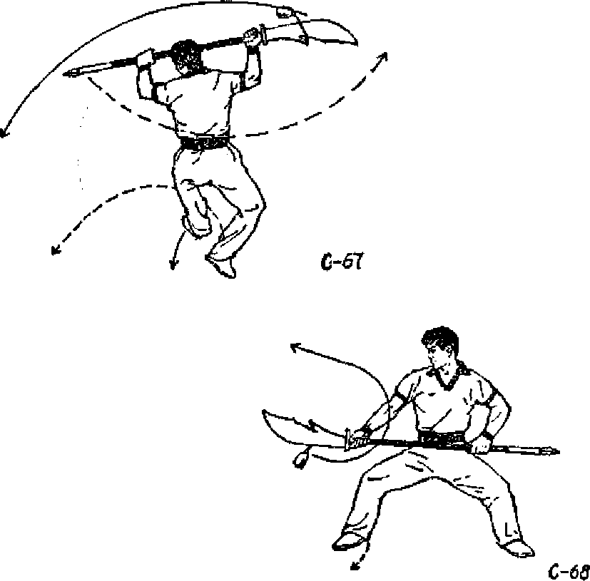 ① 左脚上前一步.同时右手向前、向下(SC65).② 上动不停,右脚上步,脚尖里扣*身体左转。同时右 手向左上、向右下使刀身在胸前立圆绕环(图C66)O③ 上动不停.右脚蹬地膊空向左转体一周,落地后成 马步*双手随身转动抡摆*落地后,中杷Jfe于腹前(图CG乙 68? o要求*本动作连做二次虏