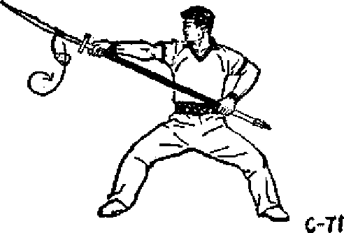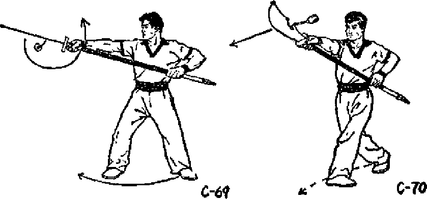 ① 右脚上前一步,同时右臂外旋屈肘回收于右腰间,手 心向上,刀刃朝前。接着右臂内旋继续向前上方、向右划 弧。手高与肩平*手心向下*刀刃朝后*目视刀尖(图C69)#
