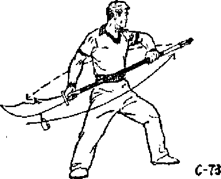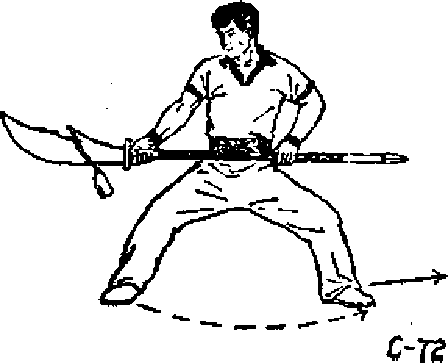 41, 横跨步斩刀①右脚向左横 跨一大*,身体略 向左转,左脚向左 上步成马步式’双 手握把不动,目视 前方(图C73).41, 横跨步斩刀①右脚向左横 跨一大*,身体略 向左转,左脚向左 上步成马步式’双 手握把不动,目视 前方(图C73).