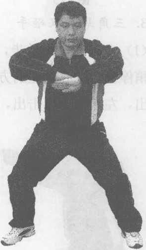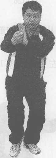 (2)右脚向前踮起,同时两臂上提,右手握拳,左手成立 掌,拇指内扣,与右拳在胸前相贴,向前平推与地面平行。两肘 稍弯曲,眼平视前方。(图123)