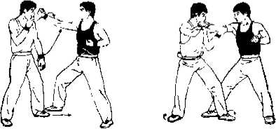 ② 甲方右掌内旋翻腕从左经上向右在头部环用前臂尺侧挡住乙方的右拳并用五指向外抓住乙方的右臆部左掌外旋半屈肘向上抓起用五指抓住乙方右手的肘关节同时左啊向前跨出半步。(图83