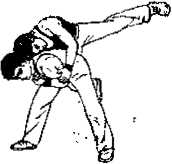 在校掌中进步并后转身在进步中要蹲身从乙方的右臂下方半身逼入(左脚在乙方的双脚中间左肩在乙方的右臂之下)。利用反关节把乙方背起而摔出要大胆地遇入一迟履期其势全失0