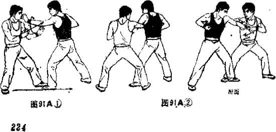 腕部内侧并用右肘向上挡开乙方的左手。(图91但)