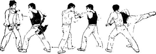 ④ 甲方若无法创乙方肘关节也可以顺其冲拳的惯性运劲后拉把乙方顺势向左后方带转拉出使之失去平衡而仆跌。(或加之腿击使之仆如